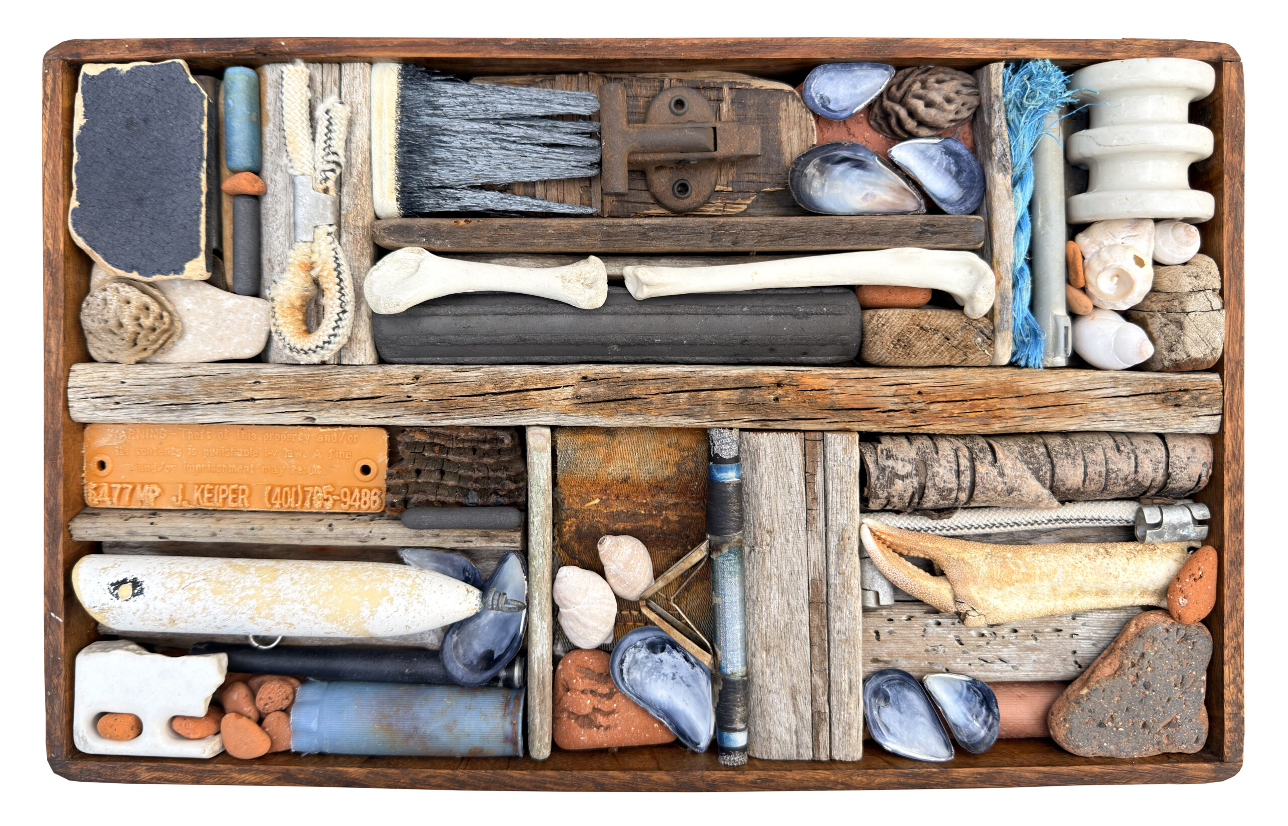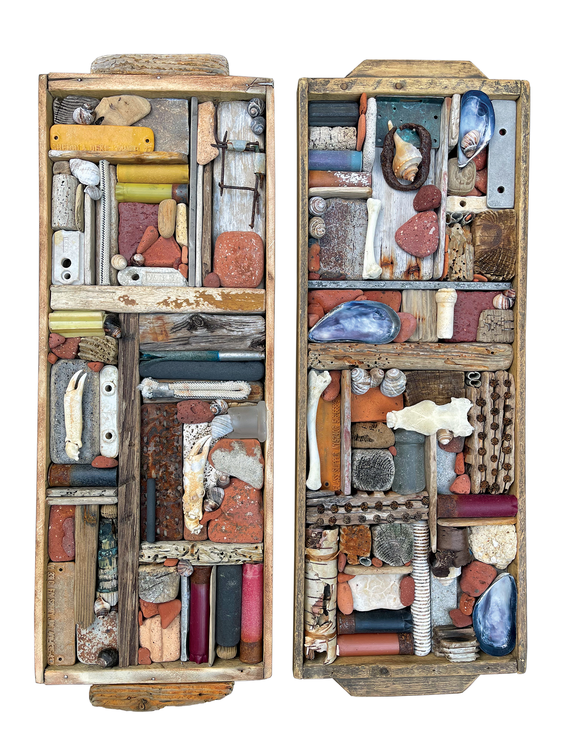 Lost and Found, Diptych Artifacts 8.5 x 23 inches each panel, 19 x 23 inches overall | Mixed media, reclaimed wood trays