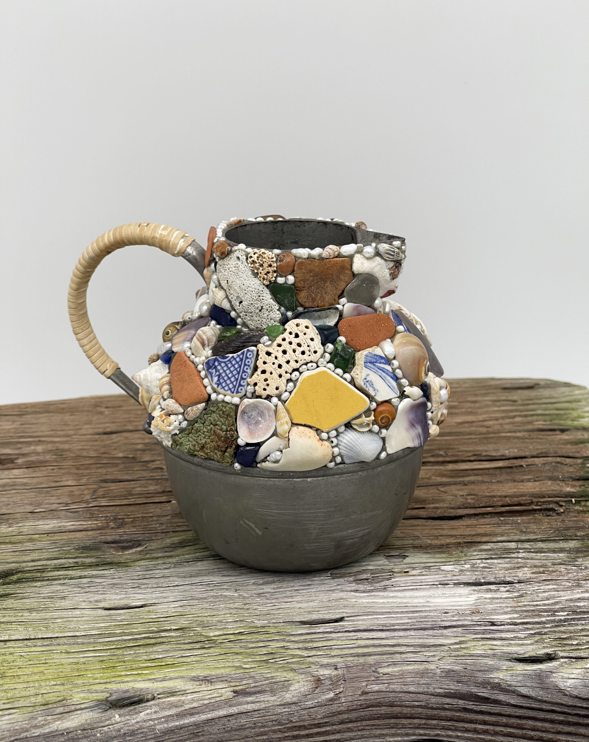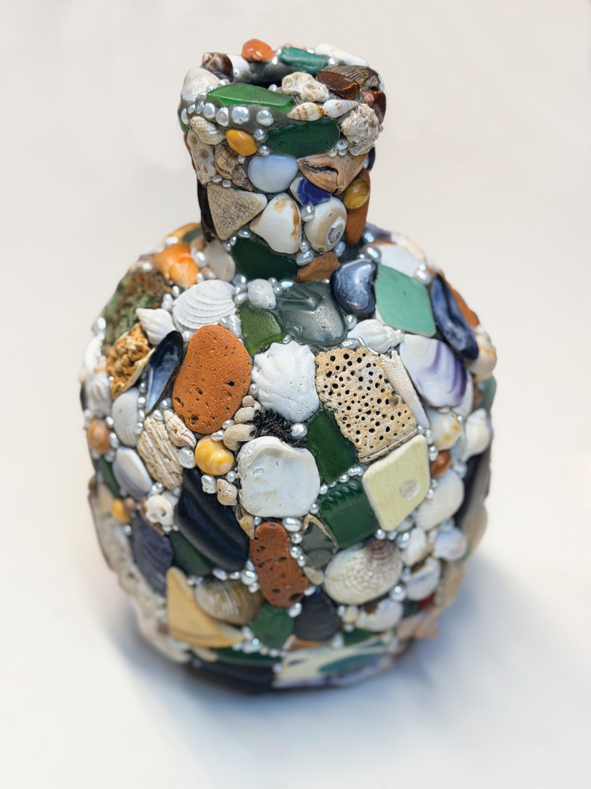 Encrusted Vessel Three-dimensional 5 1/2 x 5 1/2 x 7 1/4 inches | Glass botttle, epoxy, and shoreline findings